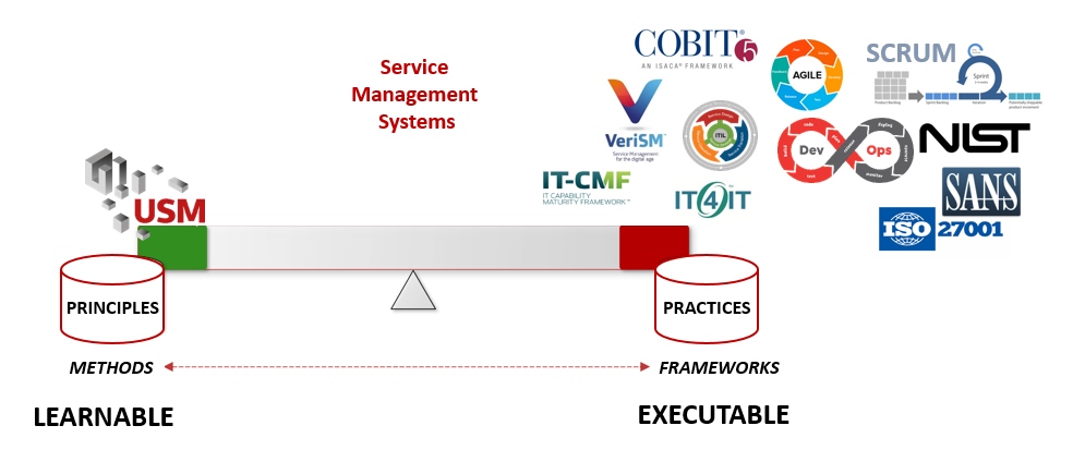 This is opposite to recent strategies followed in the Netherlands, where methods are gaining traction. These methods support principle-based strategies that aim for improving the control capabilities of organizations, by stimulating a self-learning path based on the understanding and application of management systems that follow a clear service management architecture. These approaches are predominantly learnable and they enable a well-considered application of a wide array of practices (from the popular frameworks).